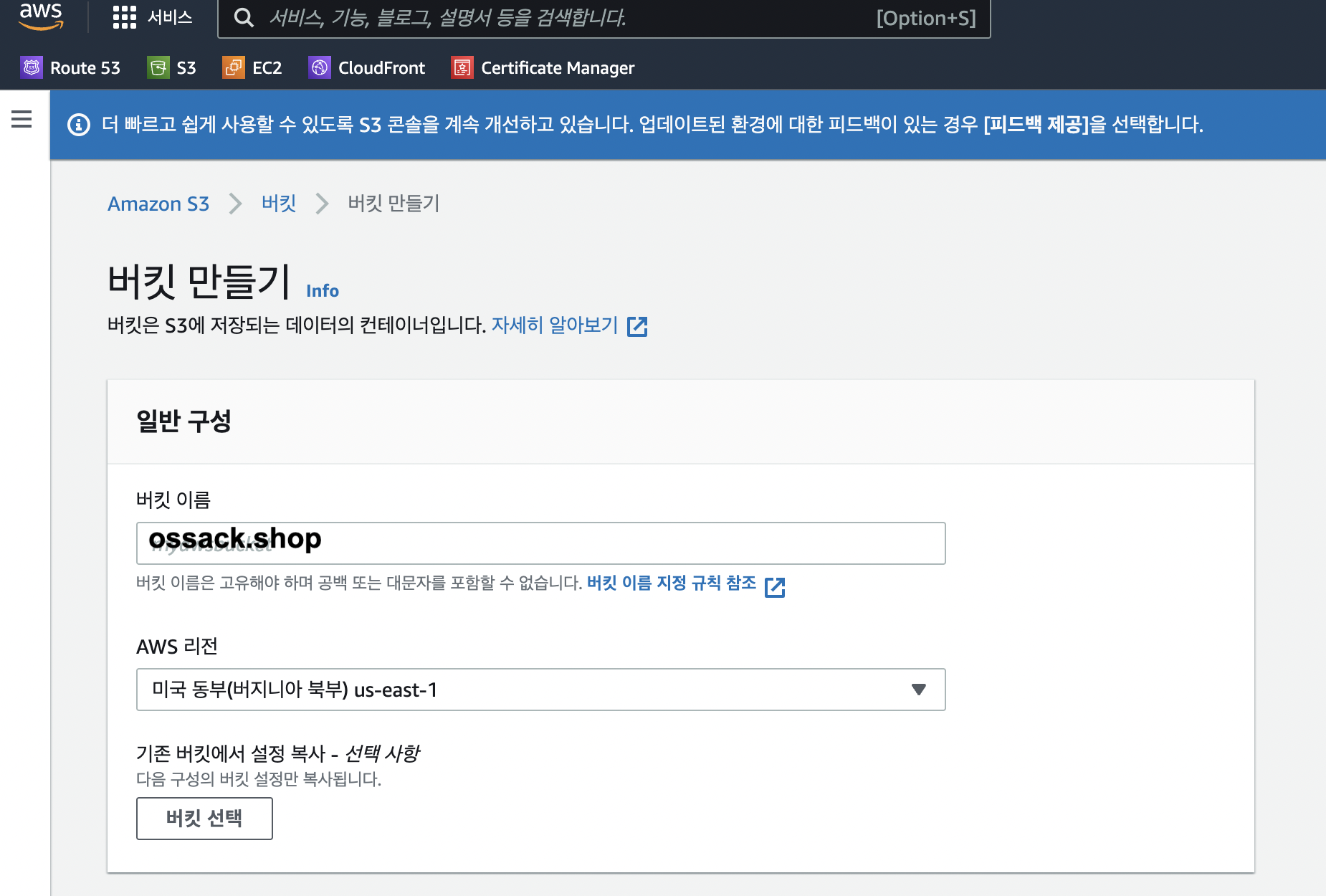 나는 버킷 이름은 ossack.shop으로 했다..ㅎㅎ