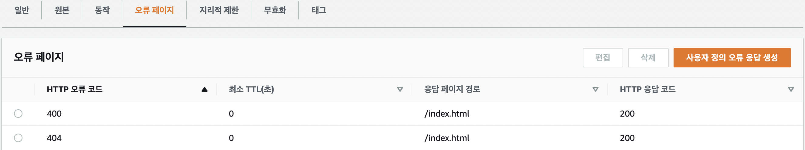Cloudfront에 403, 404 에러 발생 시, 200응답코드로 전환하고 기본 페이지(ex. index.html) 을 호출하게 설정하여야한다.