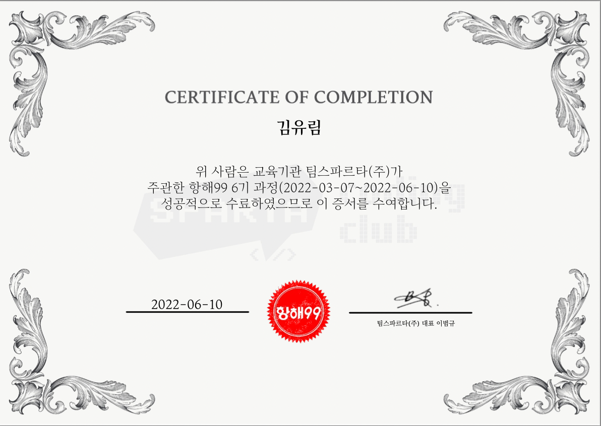항해99를 통해 많은 프로젝트를 했었는데, 포기하지 않고 매번 제출을 잘했었다. ㅎ_ㅎ