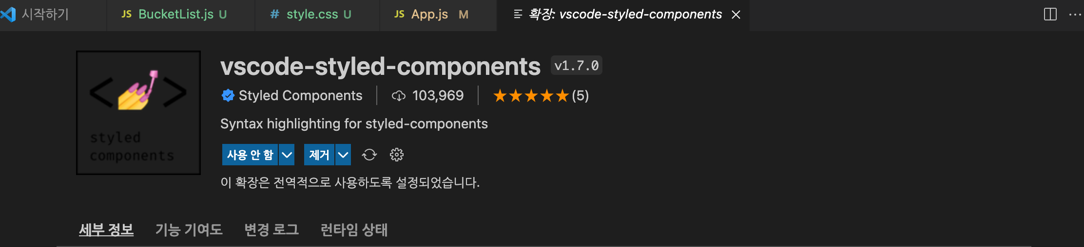 코드힌트도 안나오길래 나는 vsc 설정 > 확장 클릭해서 vscode-styled-components를 설치해주었다!